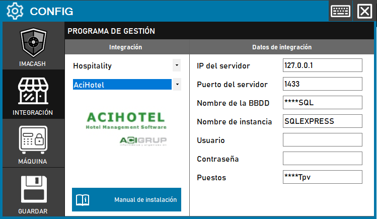 Para integrar Acihotel con ImaCash, el técnico deberá configurar la conexión con el servidor donde está instalado el sistema Acihotel y especificar los terminales del TPV del bar.
